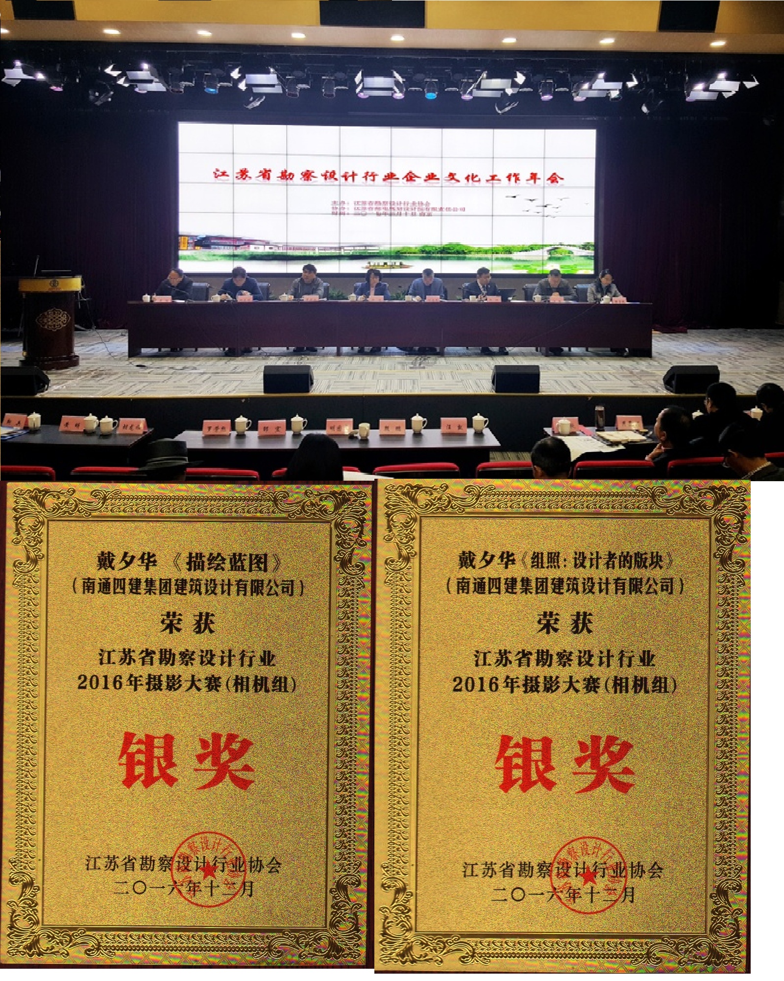 江苏省勘察设计行业2016年摄影大赛经过组委会和省专家集体讨论、研究,于近日公布评选结果。我院上报的三件作品——勘探者的剪影、描绘蓝图、设计者的版块均获得银奖,并在2017310召开的江苏省勘察设计行业企业文化工作年会上领取了荣誉奖状。